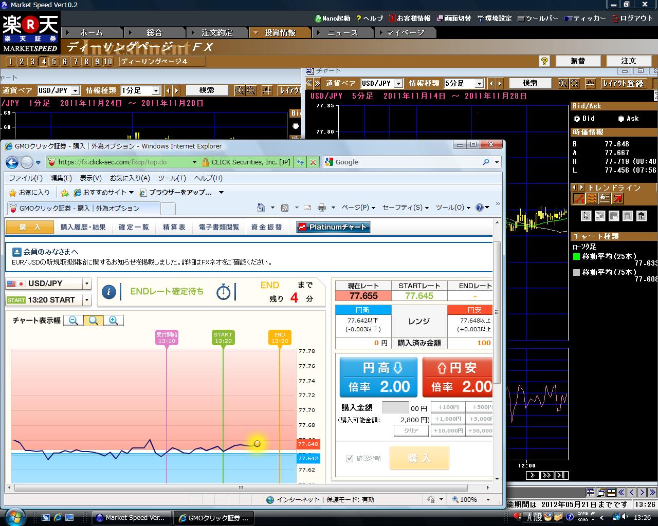 証券会社によって仕組みに若干違いがあるようですが、クリック証券の場合は、ドル円が10分後に円高か円安かを当てるというものです。掛け金は100円から5万円まで賭けることができ、当たれば2倍になって返って来て、はずれたら掛け金だけが損失となる。